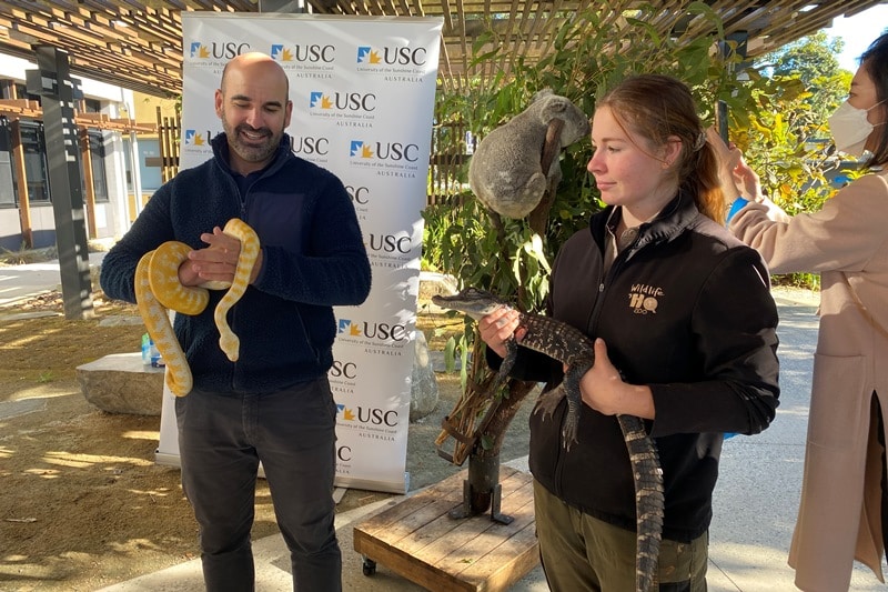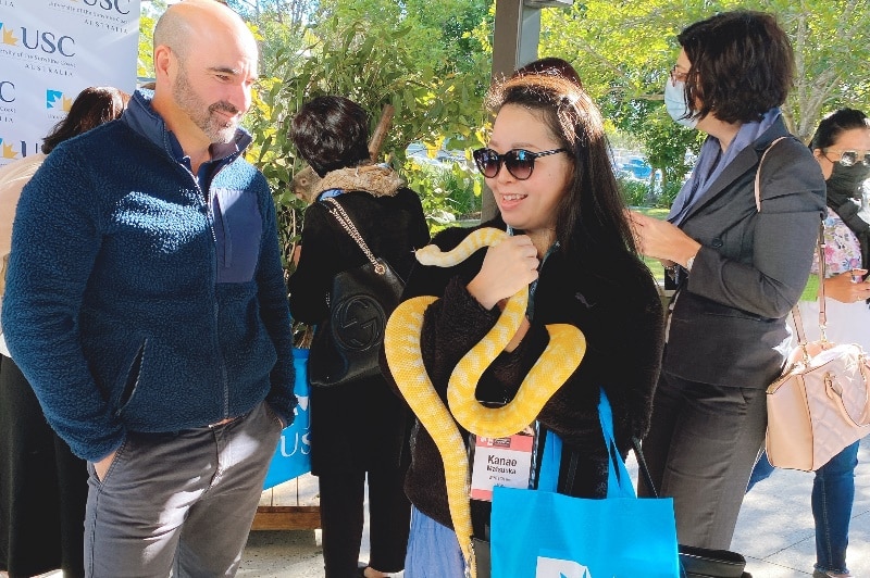 この大学はサンシャインコースト市の人口増加に伴い設立された比較的新しい大学で、特に動物生態学(Animal Ecology)という分野に力をおり、野生動物の保護や地球温暖化が動物に与える影響などについて日々研究を続けているそうです。そんな背景もあり、大学キャンパス内にカンガルーが住んでいるようです。この日はカンガルー以外にもコアラやヘビなどの動物も連れてきてくれました。