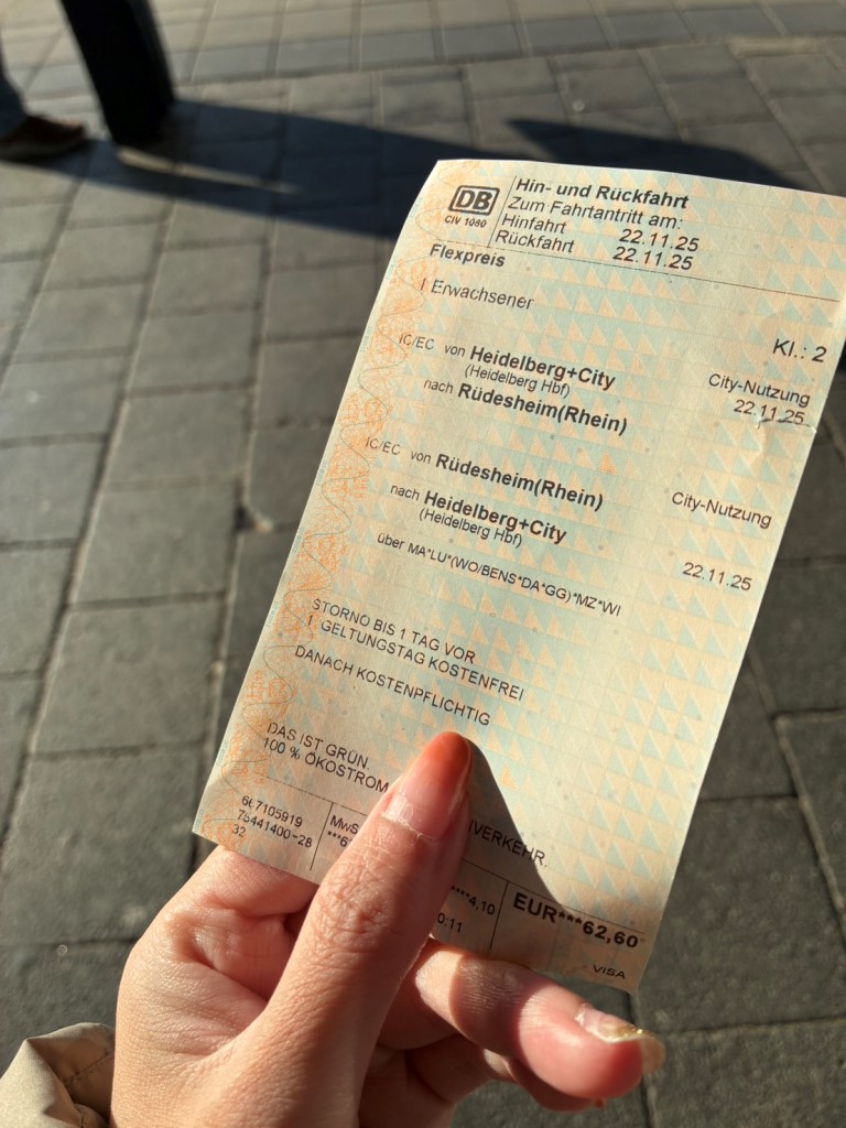 ちなみに、リューデスハイムからの帰り道では、利用していた列車が途中で運行取りやめになってしまうというハプニングもあり、「このままハイデルベルクに戻れなかったらどうしよう…」と冷や汗をかきました。なんとか鈍行列車を乗り継いでその日のうちに戻ることができましたが、ドイツ鉄道を利用する際は、常に電光掲示板を確認し、突然のアナウンスも聞き逃さないことを強くおすすめします。