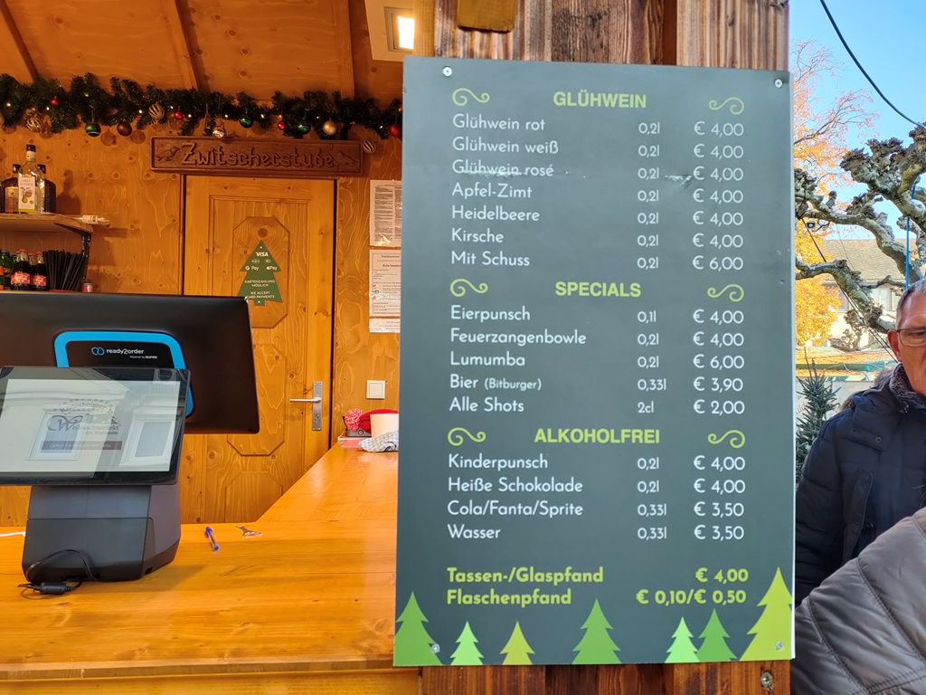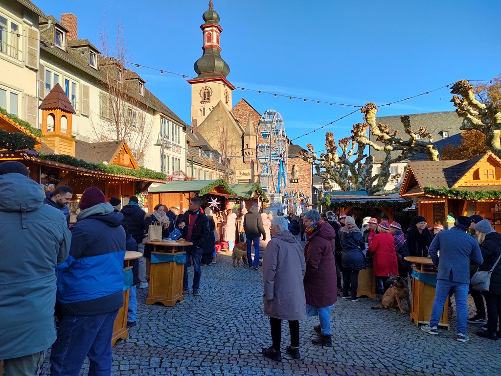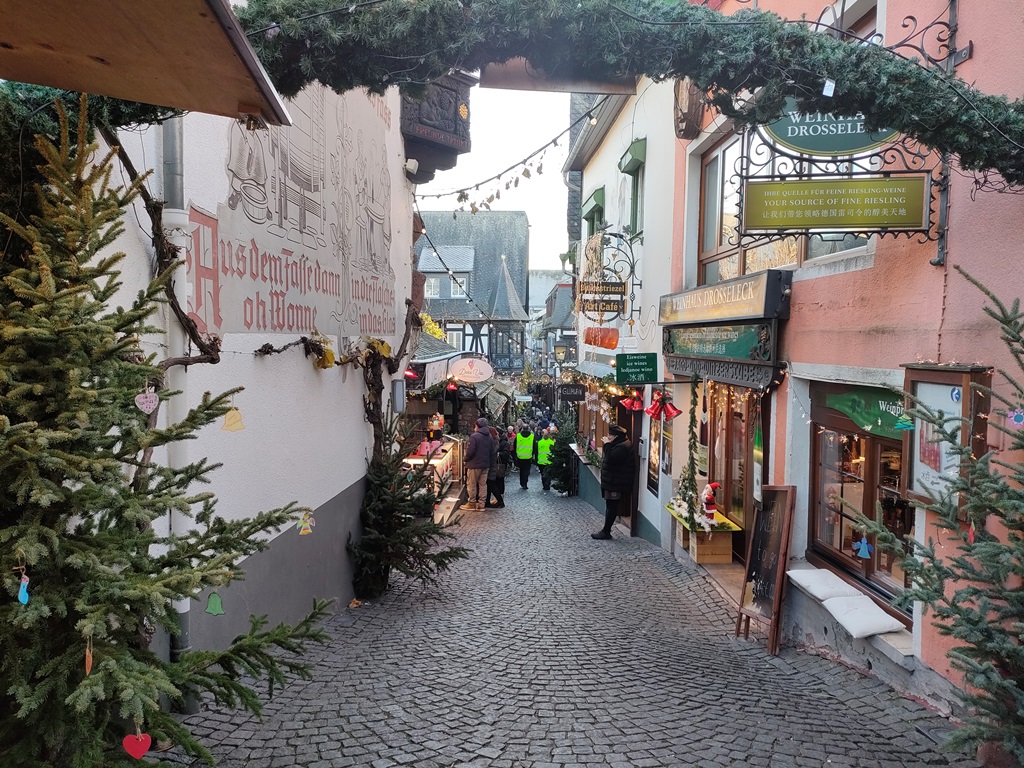 他の南ドイツの都市も、ほとんどが11月24日以降のスタート。今回はご縁がなかったかな…と一度はあきらめかけたのですが、現地に到着して旧市街を歩いているうちに、「やっぱりどこかのクリスマスマルクトを見たい!」という気持ちが抑えきれなくなり、帰国前日の土曜日に高速列車ICEで片道約2時間半、ワインの町・リューデスハイムまで足を延ばすことにしました。