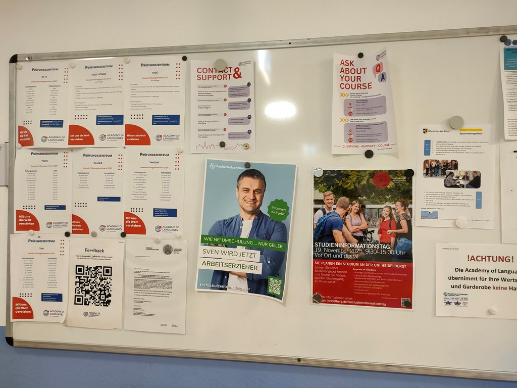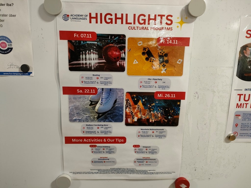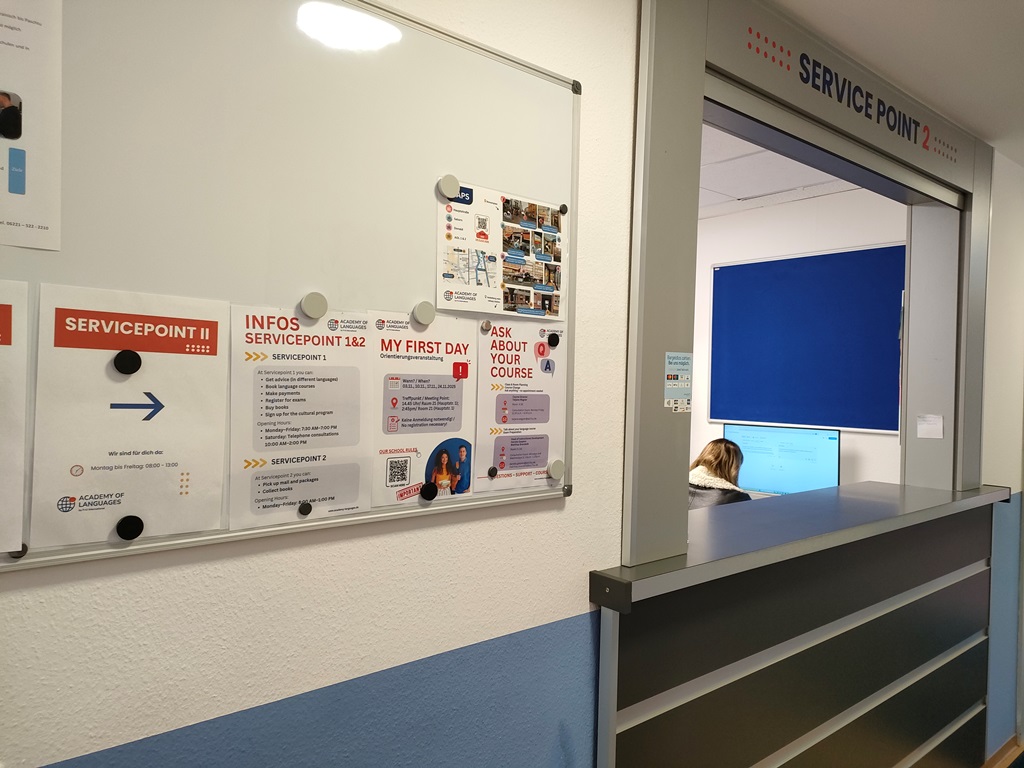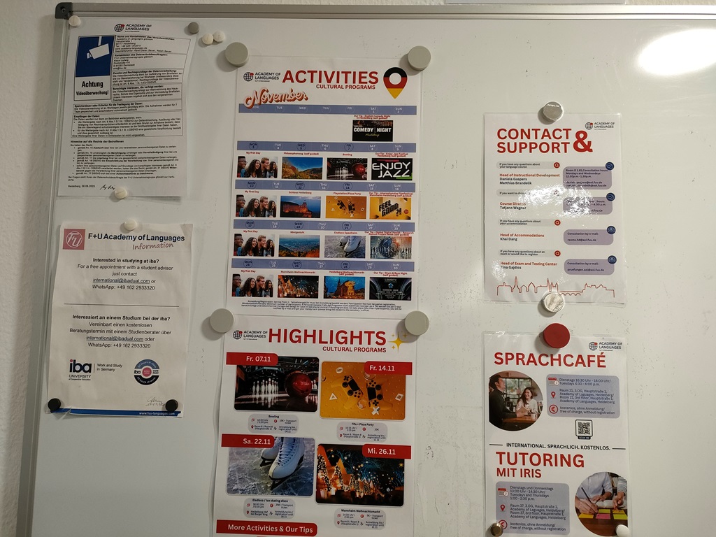 F+Uには現在、日本人スタッフが2名在籍しています。学校初日の授業後には、日本語による「初日オリエンテーション」が行われ、生活の注意点や手続き、学校のルールなどを丁寧に説明してもらえます。その後も、メインキャンパス受付のすぐ隣にある相談室で、日本語での個別相談が可能です。ドアに予約表が貼ってあり、空いている時間帯に自分の名前を書き込む仕組みになっています。