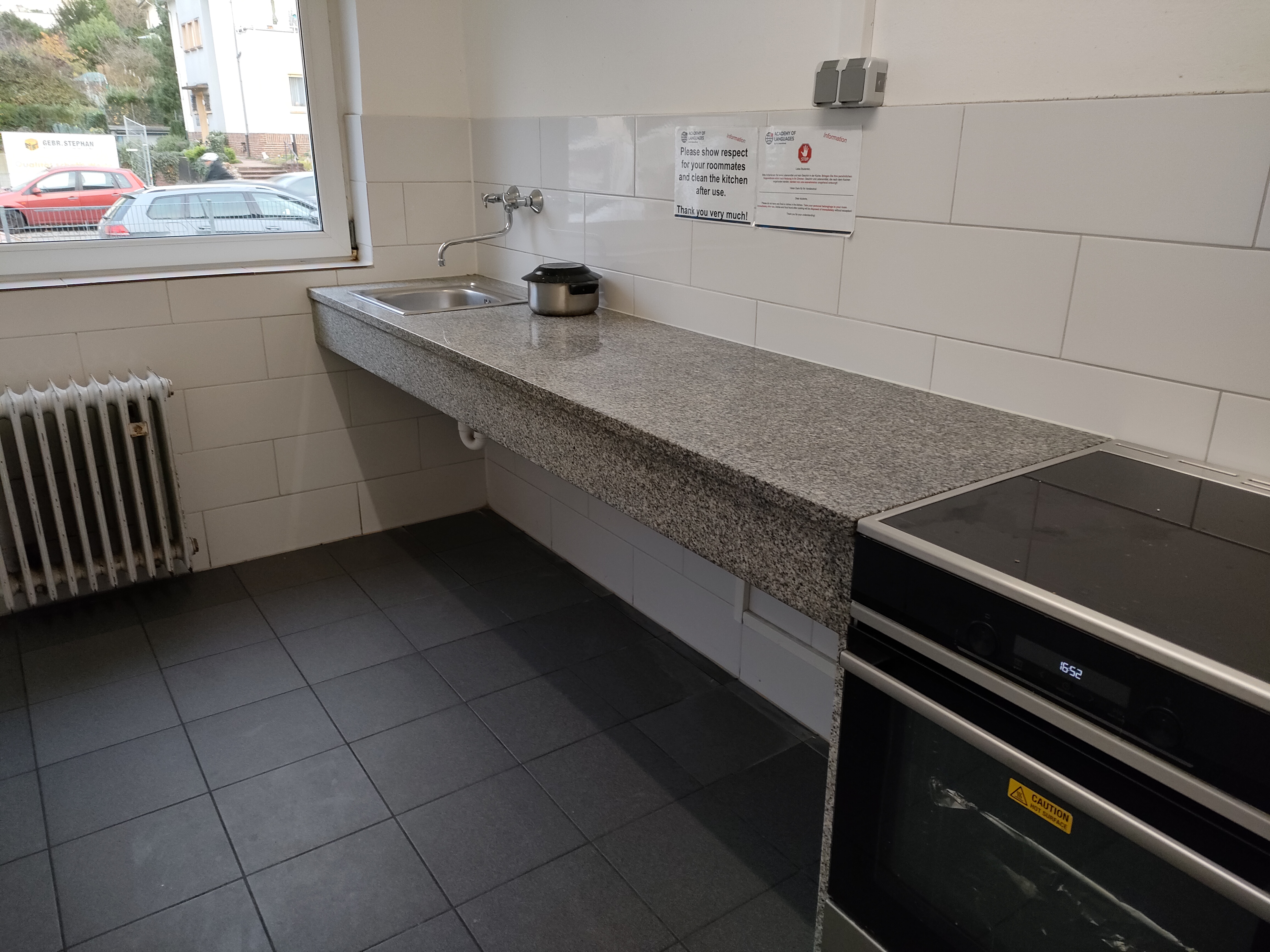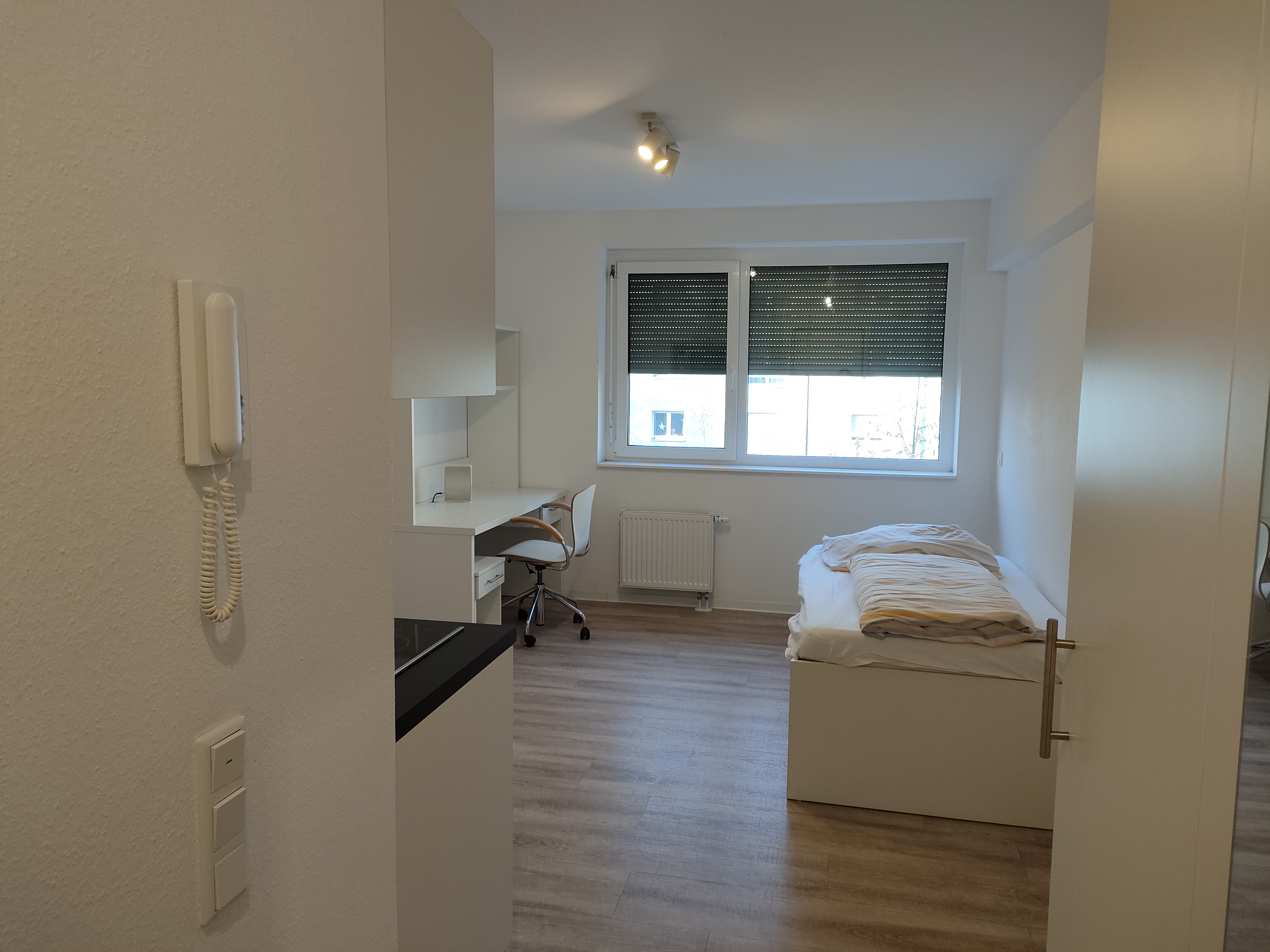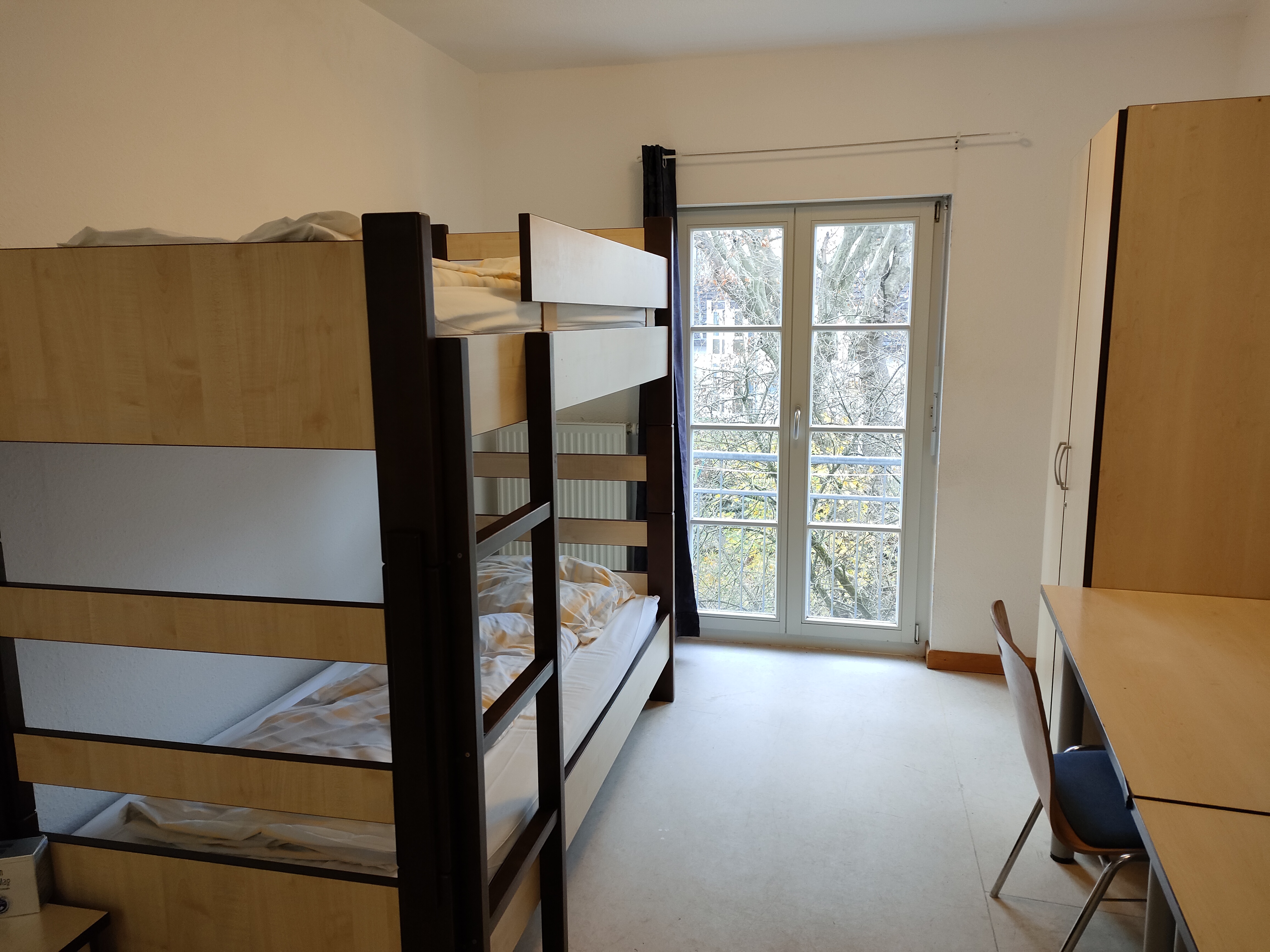 基本的にはどの寮もシングルルームですが、カテゴリーによって「専用バス・キッチン付き」「共同バス・キッチン」「学校までの距離」などの条件が変わります。私が滞在した部屋は、簡易キッチン・バス・トイレがすべて専用で、F+Uの校舎までは路面電車で約15分という便利な立地でした。ハイデルベルク中心部からもアクセスが良く、通学にも生活にも不便はありません。