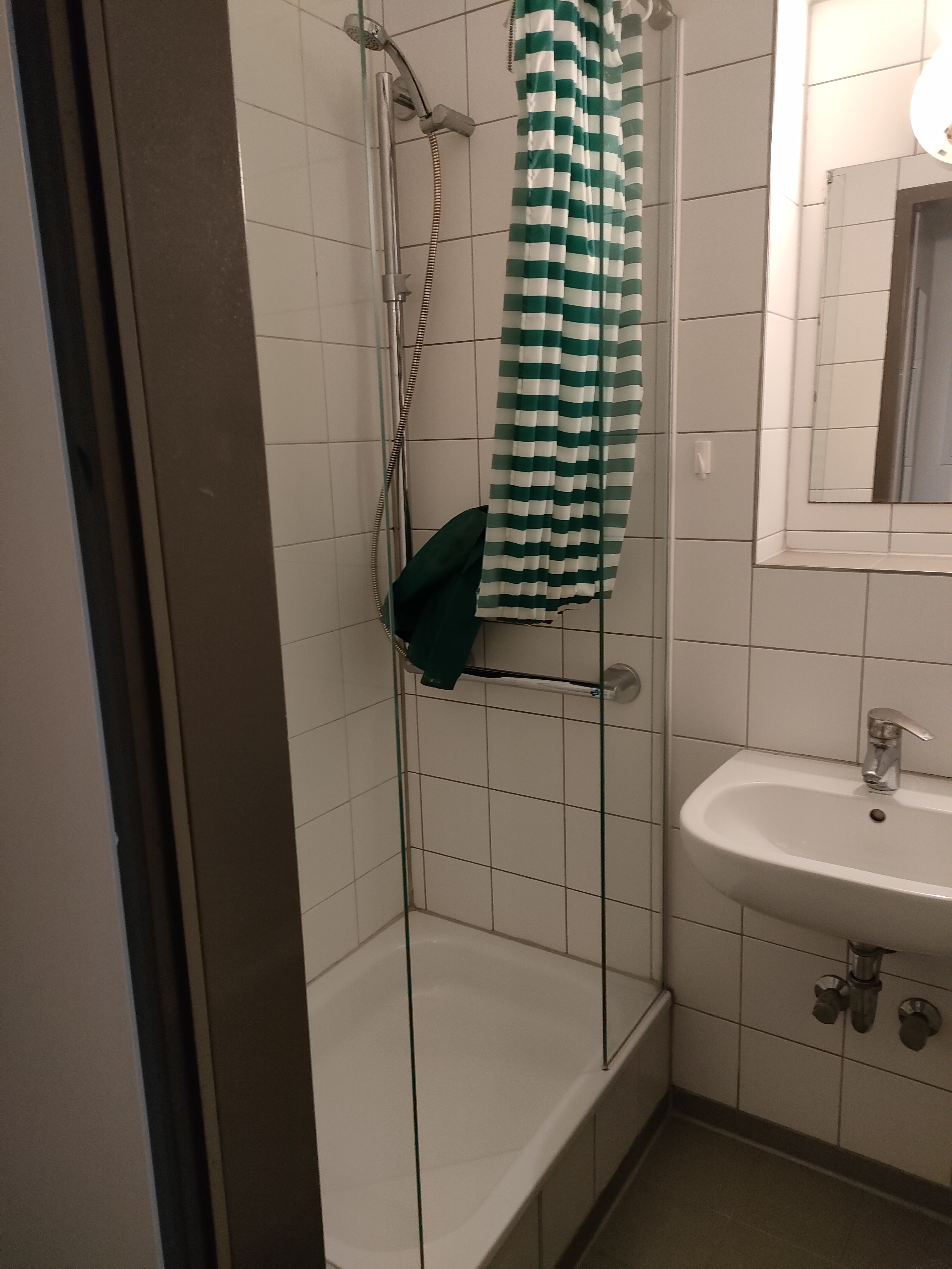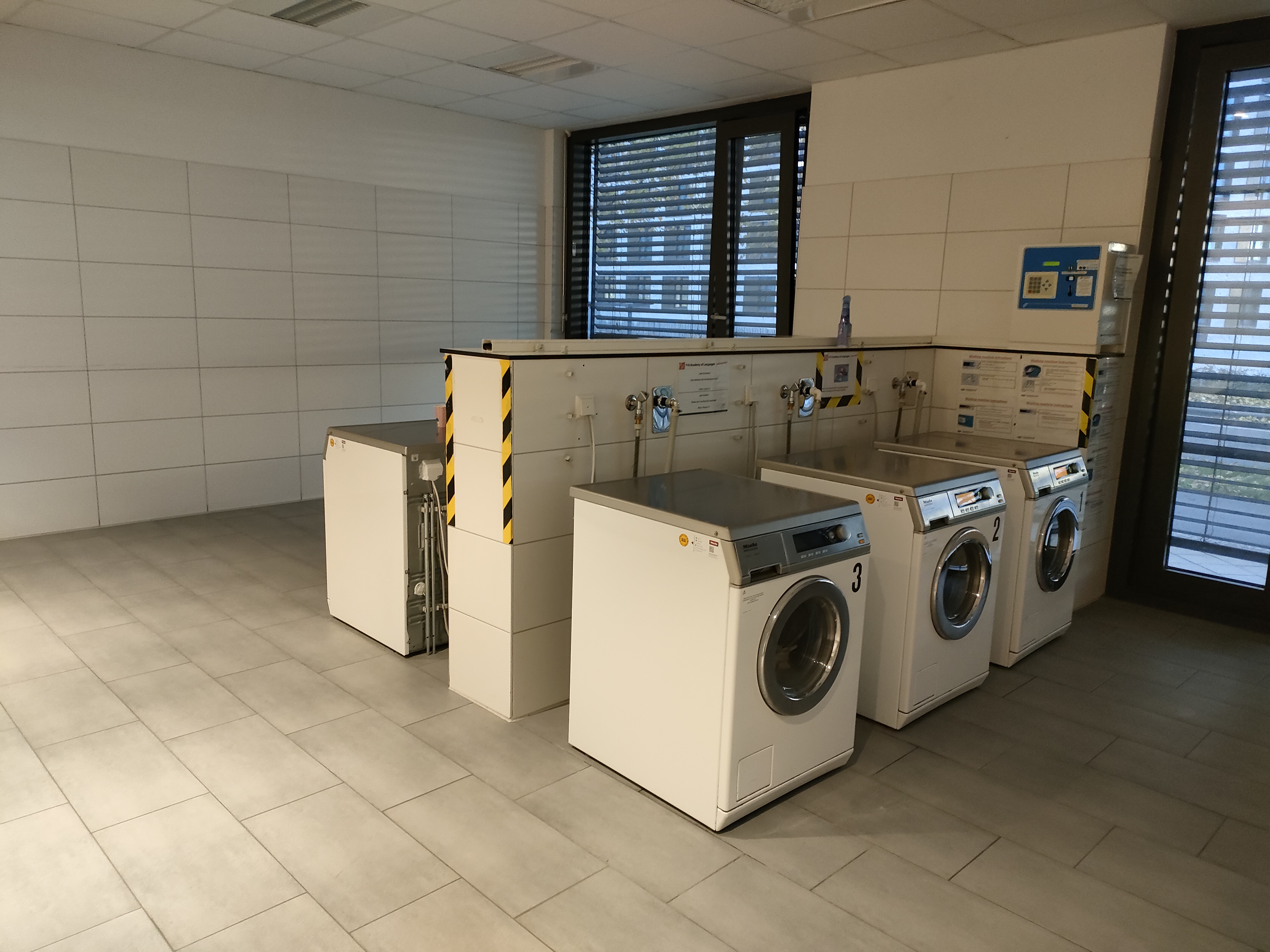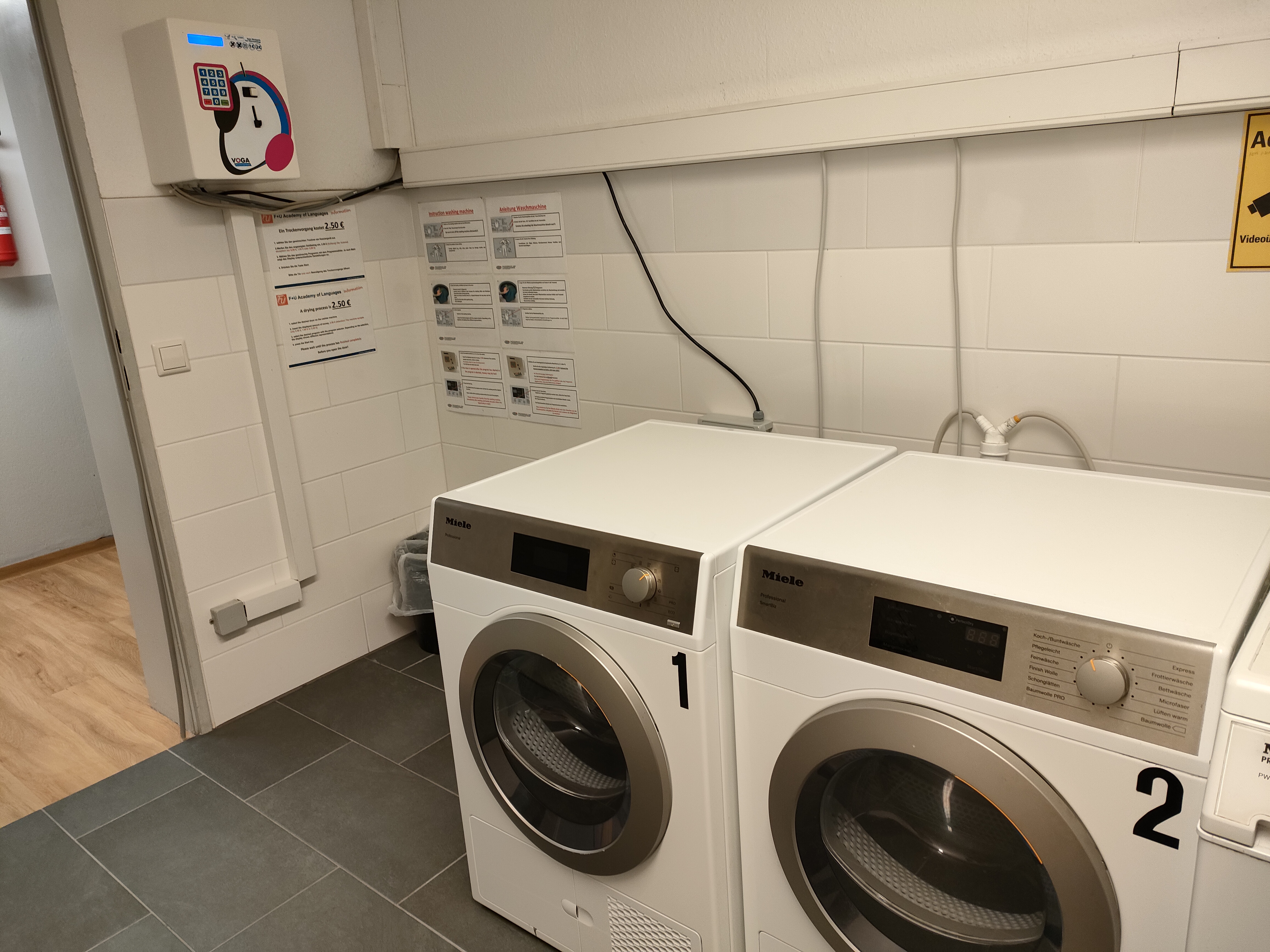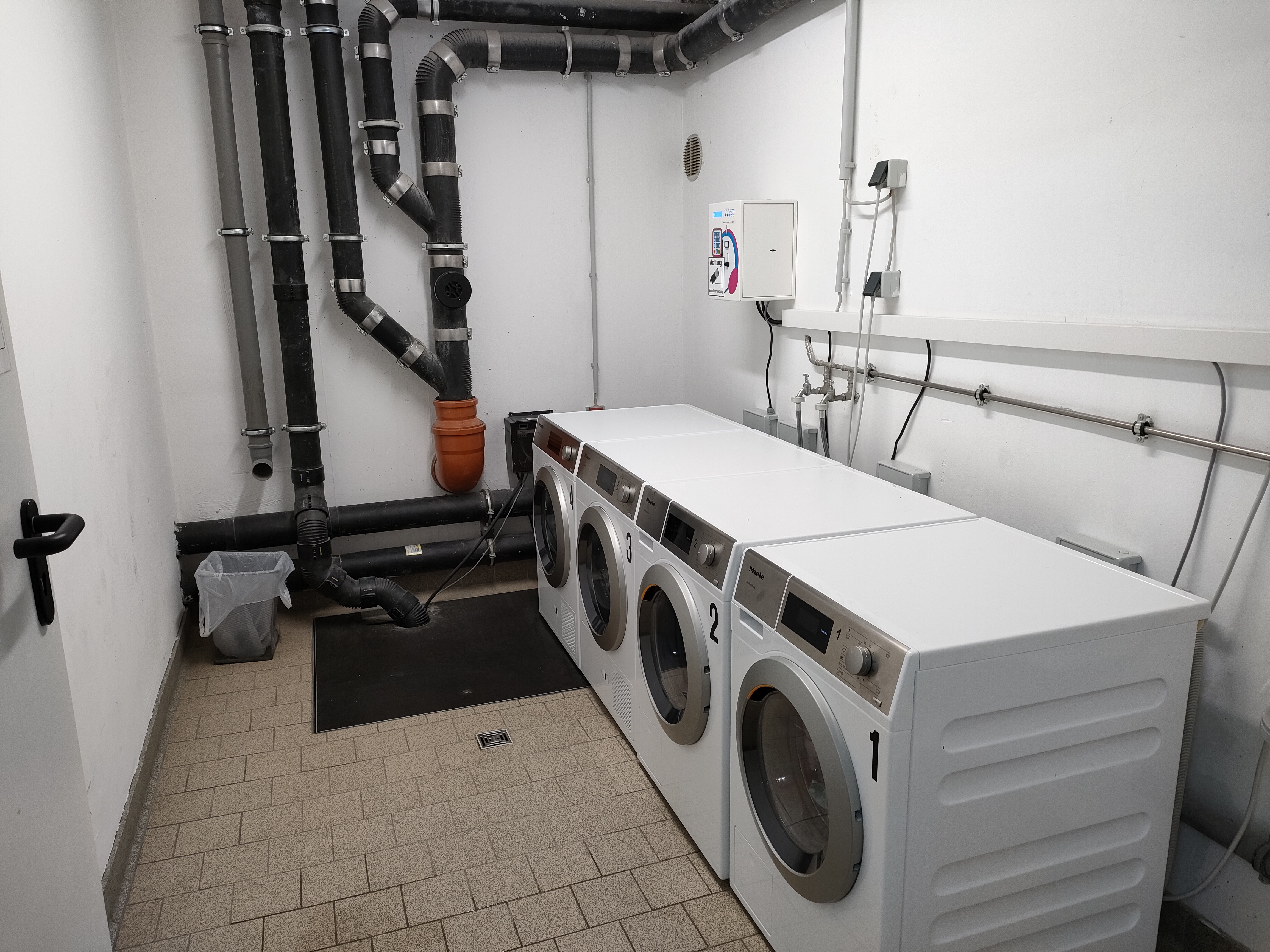 寮の1階には大きなランドリールーム、地下にはごみ置き場があります。洗濯は1回4.5ユーロ程度(寮によって多少異なります)ですが、今回のように短期滞在であれば、洗面台やシャワーで手洗いしてしまうのも一案です。