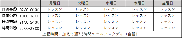 プログラムは週20 レッスン(15 時間)のオンラインレッスンと週10 レッスン(7.5 時間)のセルフスタディ、合計週30 レッスンで構成されています。